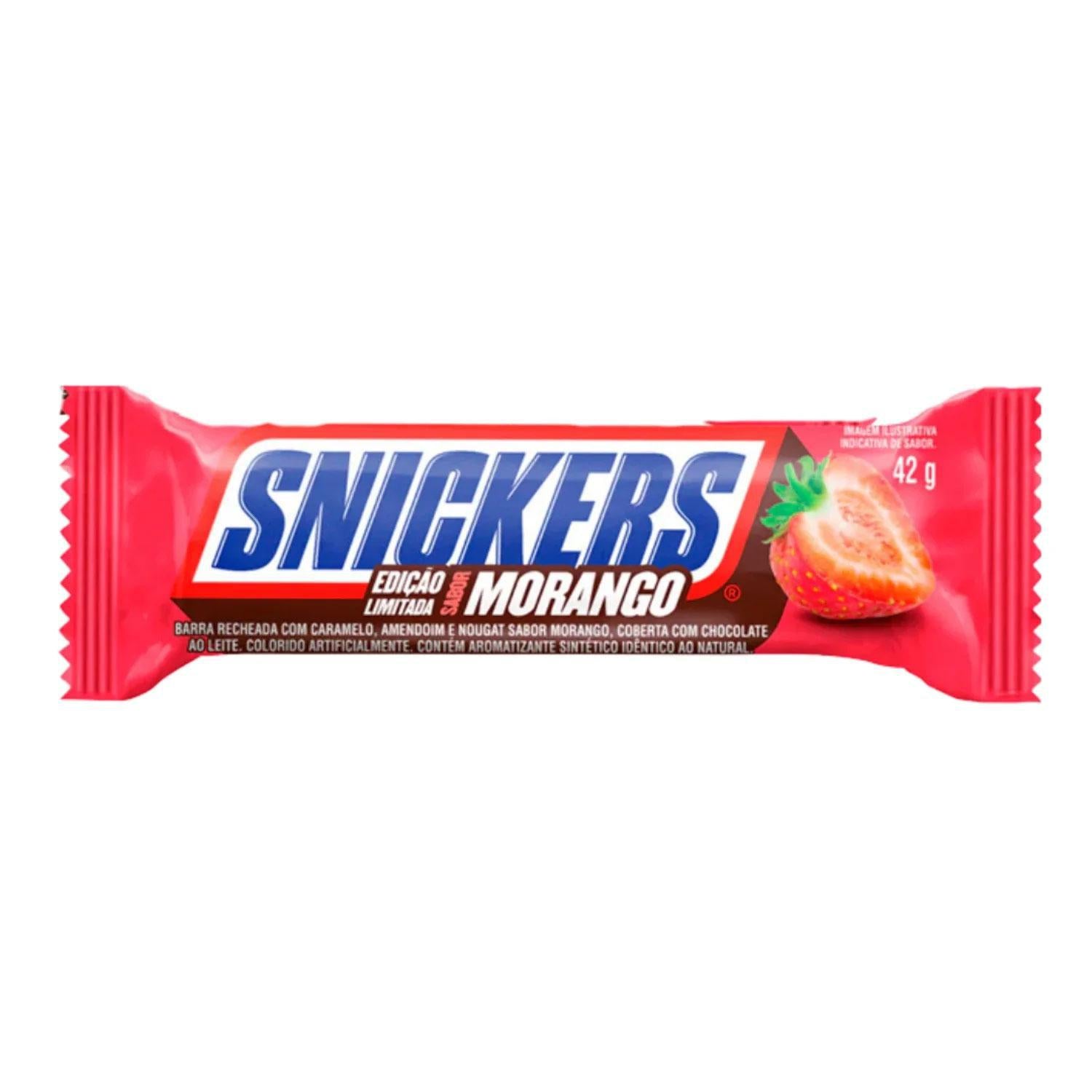 Authentic Brazilian Chocolate Mousse de Morango Snickers 42g delivers a limited-edition fusion of creamy strawberry mousse nougat, crunchy peanuts, rich caramel, and smooth milk chocolate coating.